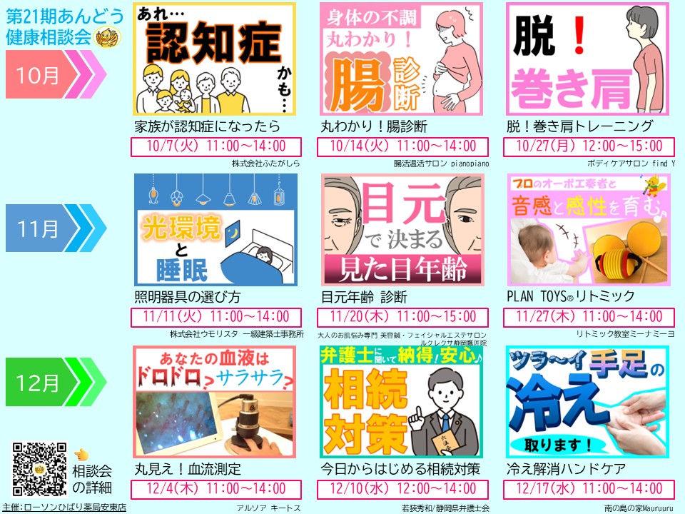 当薬局にて定期開催していますあんどう健康相談会の第21期スケジュール(2025年10月~12月開催分)が確定しましたので、ご案内です♪