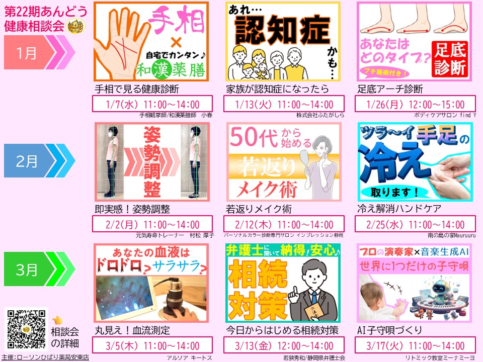 当薬局にて定期開催していますあんどう健康相談会の第22期スケジュール(2026年1月~3月開催分)が確定しましたので、ご案内です♪